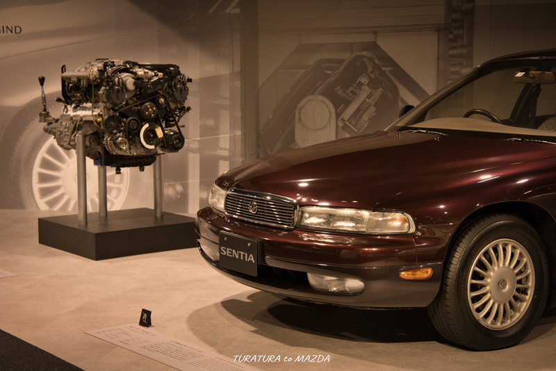 リニューアル前より展示台数が増えたのでさらに壮観な光景となりましたが、個人的にこの展示スペースで最も見たかったのがセンティアの横に展示されてるこのエンジン・・・。