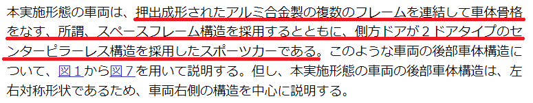 こちらはマツダの特許でおなじみになっている「アルミ製スペースフレームを採用したスポーツカー」に関する特許ですが、その中でも今回取り上げてる特許はスペースフレームの構造だけでなくリア周りのエクステリアデザインまで説明図に描かれているのが大きな特徴。