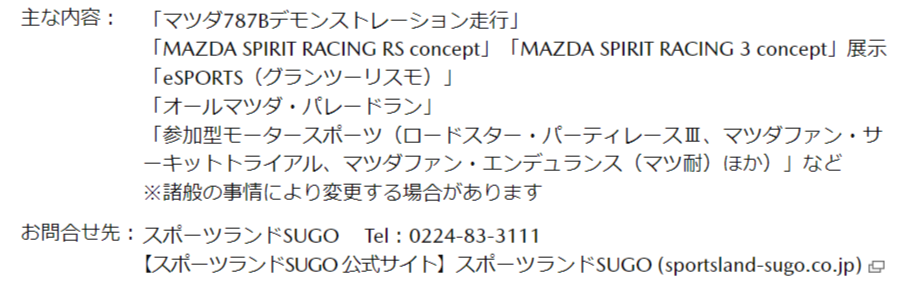 2024年度第一弾となるMAZDA FAN FESTA 2024 IN TOHOKUに関しては内容の一部が発表されており公式サイトも本日公開。