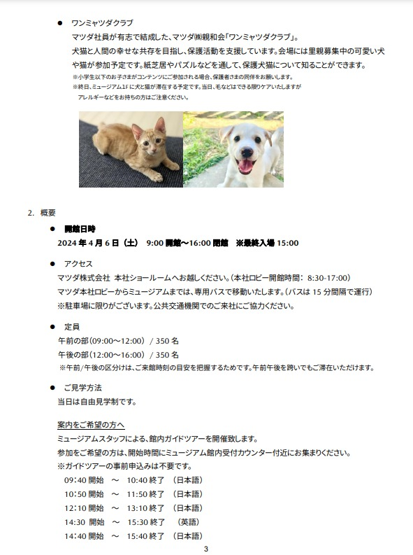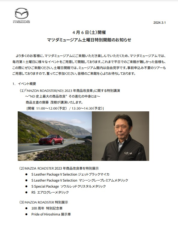 毎月一回土曜日特別開館を実施しているマツダミュージアムですが、2024年4月の内容が公開されています。