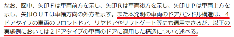 こちら2件は「格納式ドアハンドル」に関する特許ですが、資料では4ドア・2ドア車両方を視野に入れてる事が明記されています。