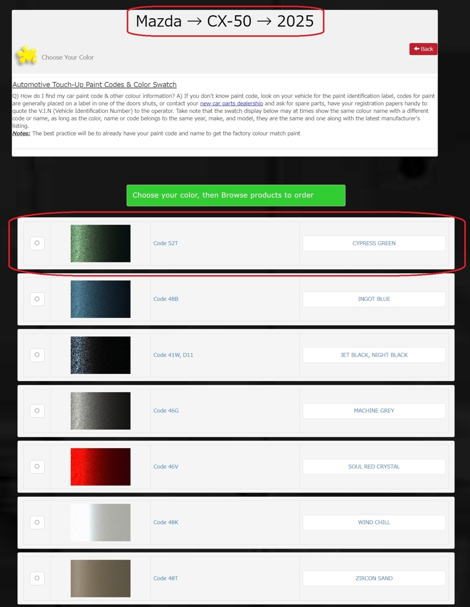 そこで塗料メーカーのデータベースを見てみると確かにCX-50 2025年モデルのボディカラーラインナップに含まれていて、カラーコードも"52T"なので一致します。