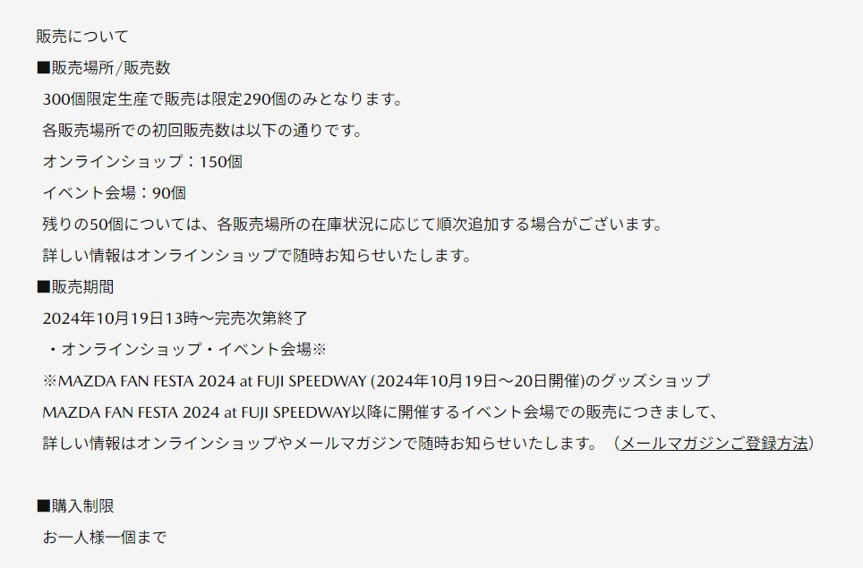 今回紹介した新グッズは全て10月19日13時から公式オンラインショップで販売・注文受付開始予定と案内されていますが、19日と20日に開催される"MAZDA FAN FESTA 2024 at FUJI SPEEDWAY"の会場でも販売されるとの事。