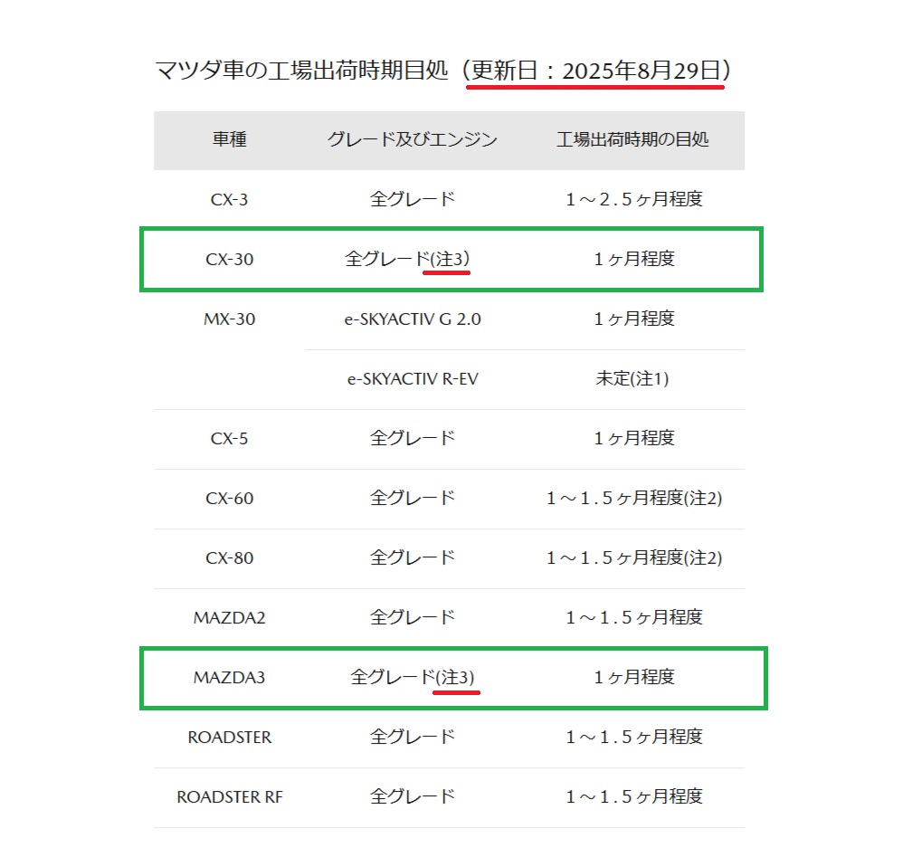 〇マツダ公式HP・工場出荷時期目処案内ページ